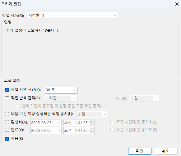 따라서 작업 스케쥴러에서 이 코드가 부팅 후 15초 뒤(안정성 확보)에 실행되도록 설정해줍니다.